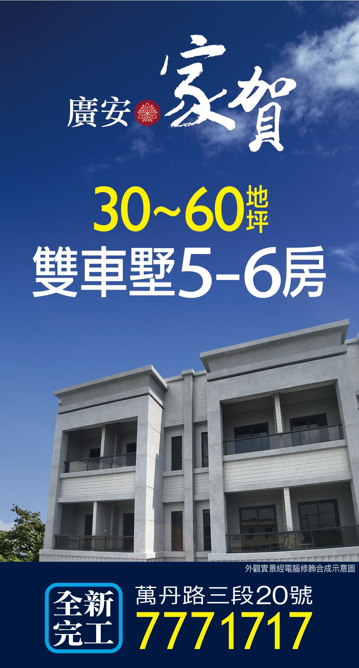 大港事業集團(和成開發建設股份有限公司)續(橋頭家賀)再推出位於廣安正市心,投資興建限定六戶車庫別墅,「廣安家賀」,規劃6戶住商辦三效合一雙車別墅,戶戶臨路,地坪30-60坪,建坪53-60坪,一樓規劃獨立客廳及獨立餐廚空間,2F大主臥,規劃5-6房。